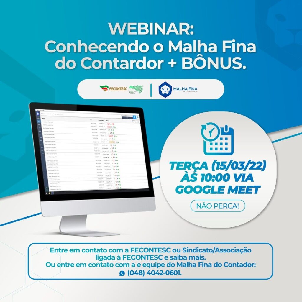 Amanhã, terça-feira (15/3), numa parceria dos Sistema Fecontesc/Sindiconts promove uma live para apresentação da Malha Fina do Contador, uma ferramenta exclusiva para contadores, que otimiza o processo de Análises de Caixa das Declarações de Imposto de Renda da Pessoa Física (IRPF). A reunião será das 10h às 11h pelo Google Meet (Link da videochamada: https://meet.google.com/foh-hkoj-zdg […]