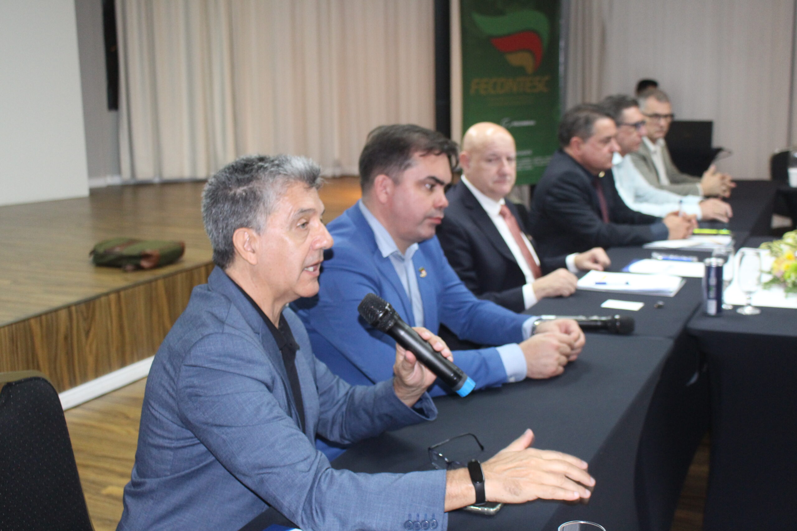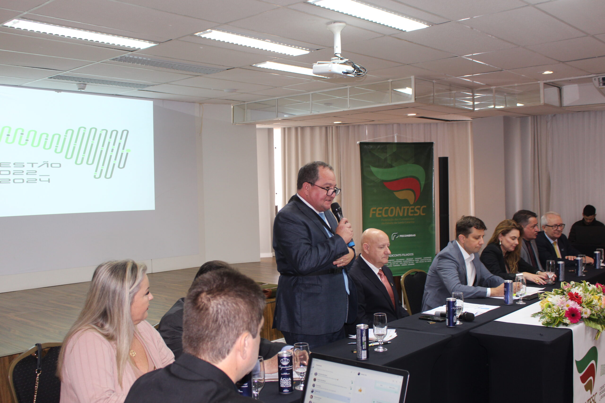 Ocorreu hoje (21/6) a Assembleia Geral da Fecontesc, em Balneário Camboriú, com a presença da Diretoria da entidade e os presidentes dos Sindiconts de todo o Estado. Na abertura do evento, o presidente da Federação Dalvair Anghében destacou a importância desta troca de informações que servem para o aperfeiçoamento das atividades em cada entidade.