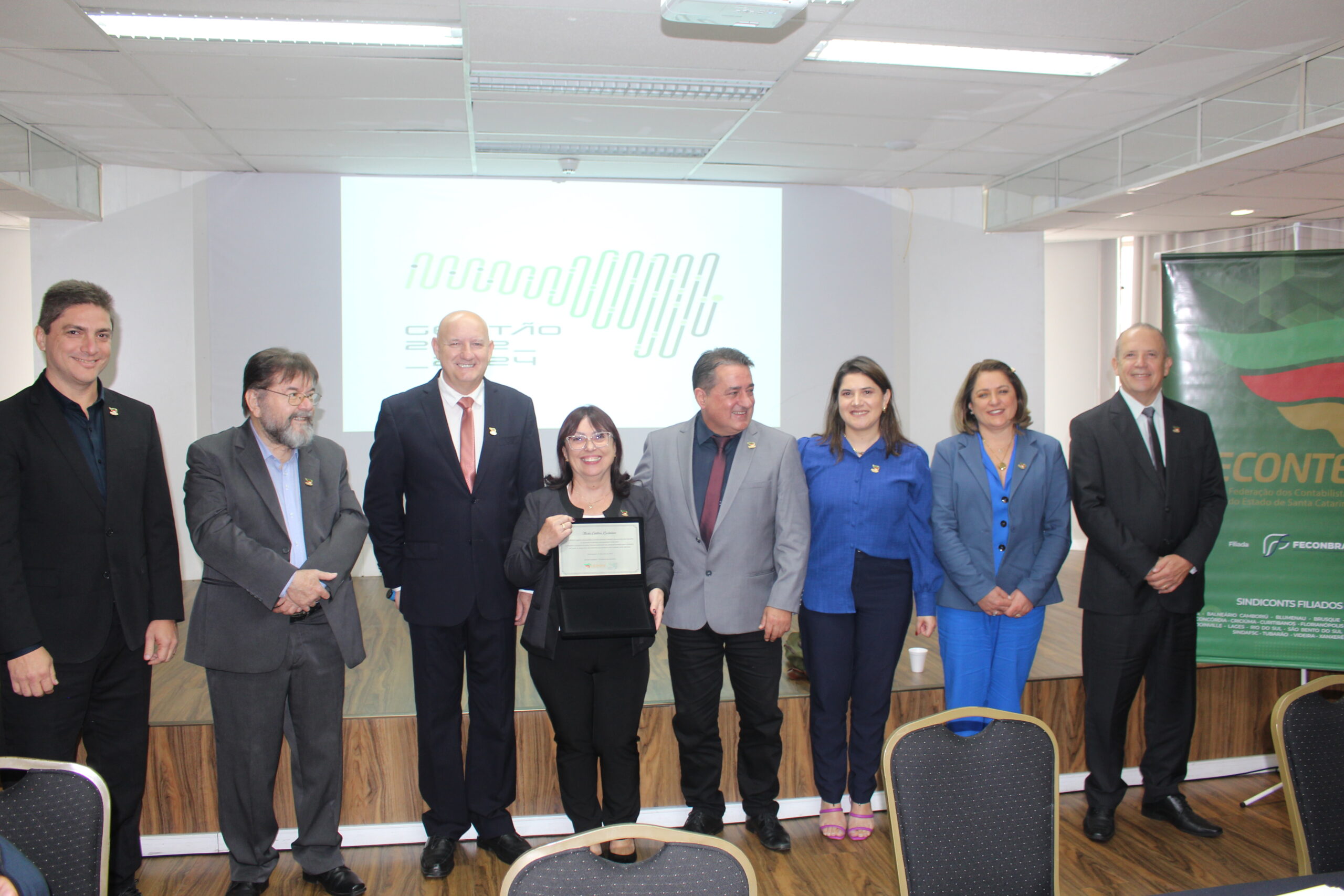 Homenagem – A secretária executiva da Fecontesc, Maria Cristina Knolseisen, foi homenageada por toda a Diretoria pelos dez anos de serviços prestados à Federação. Os presentes aplaudiram de pé a entrega de uma placa comemorativa à data em reconhecimento à dedicação e competência.
