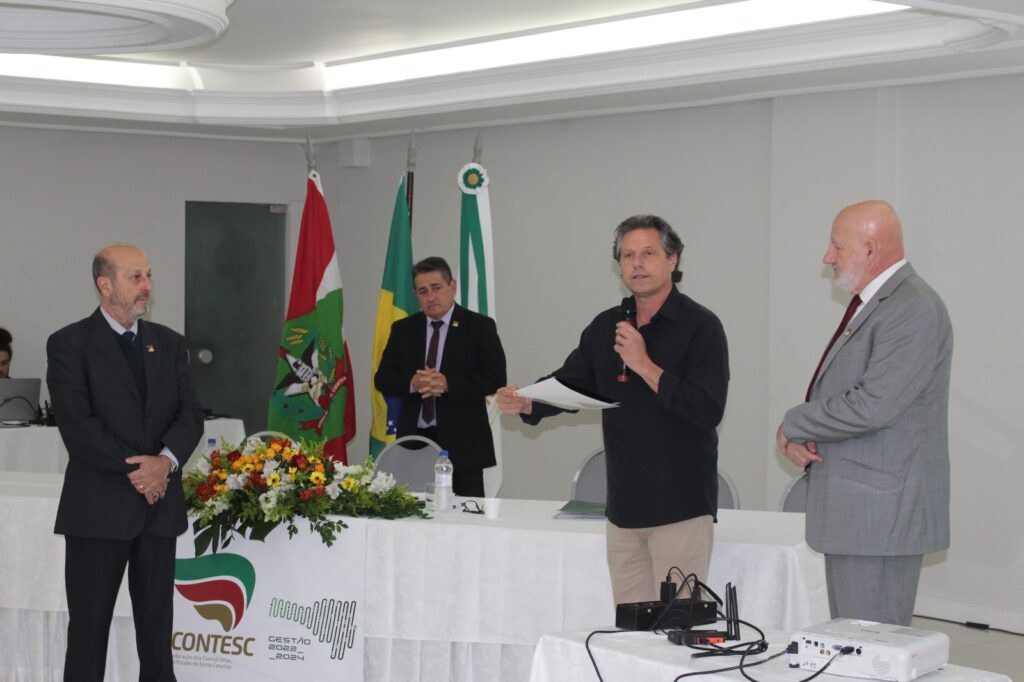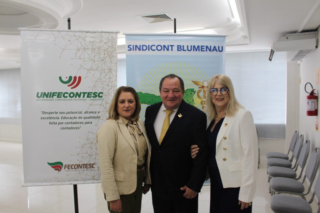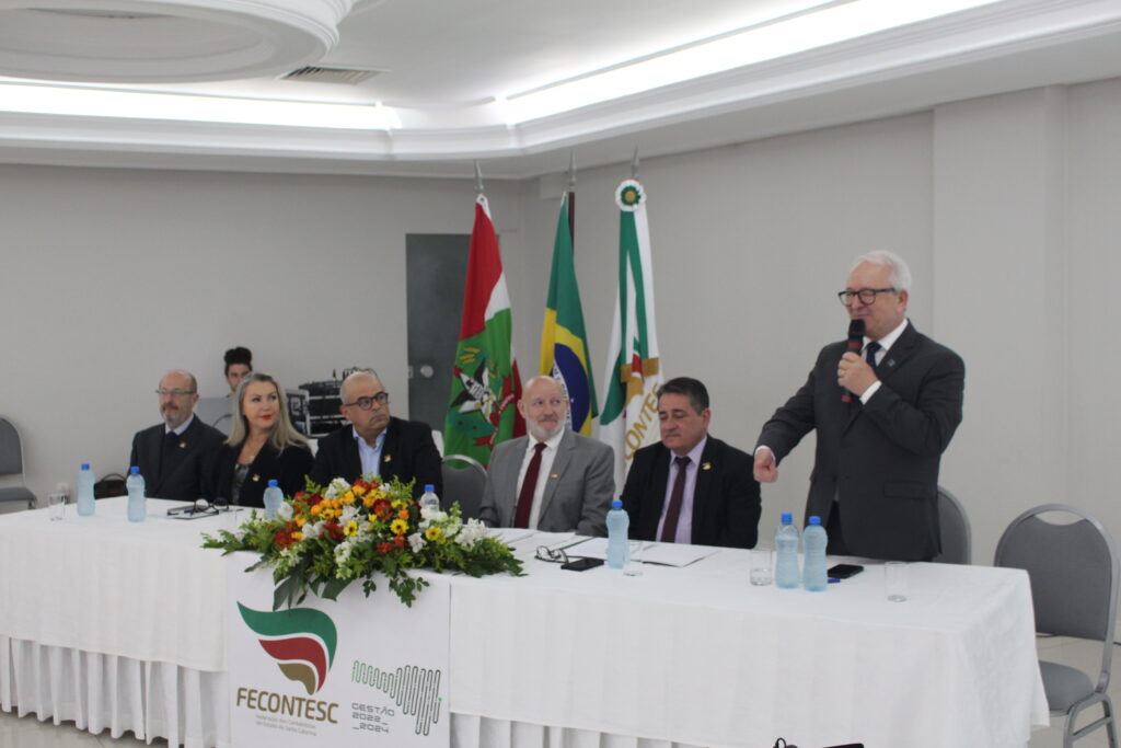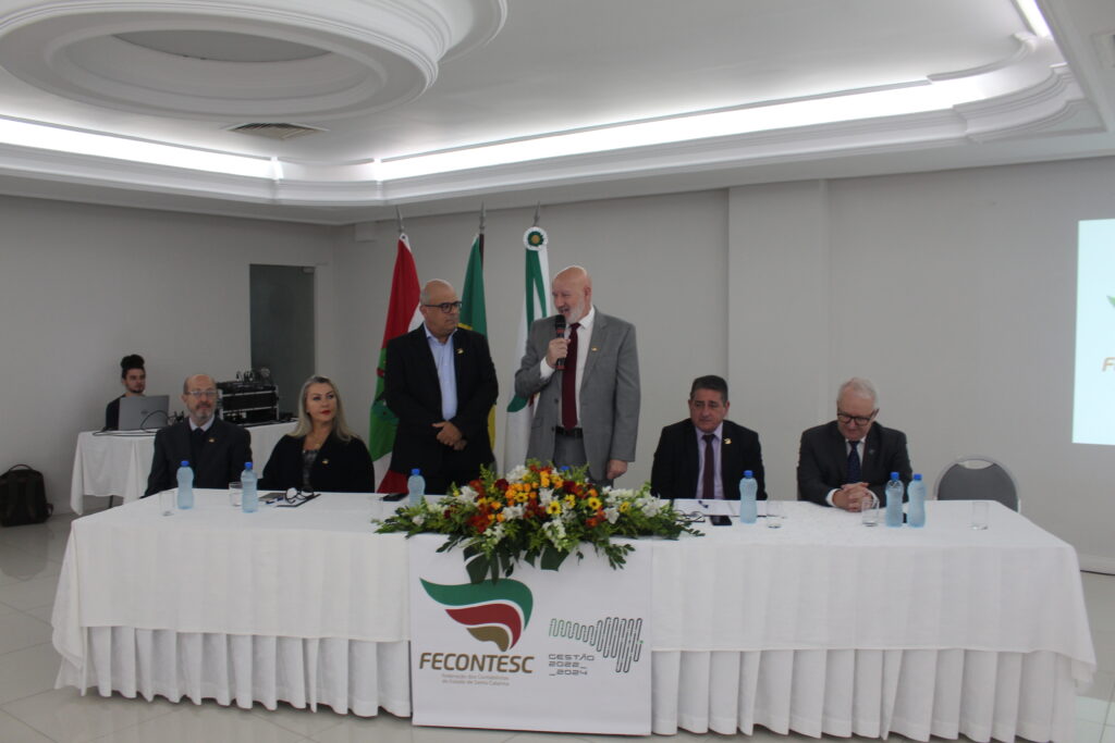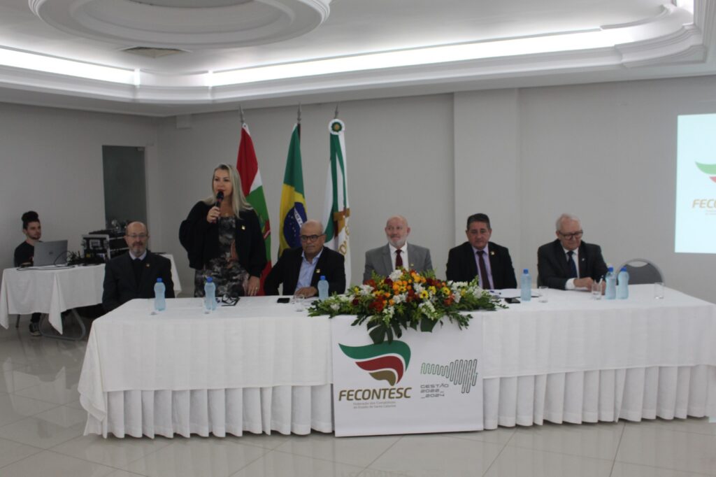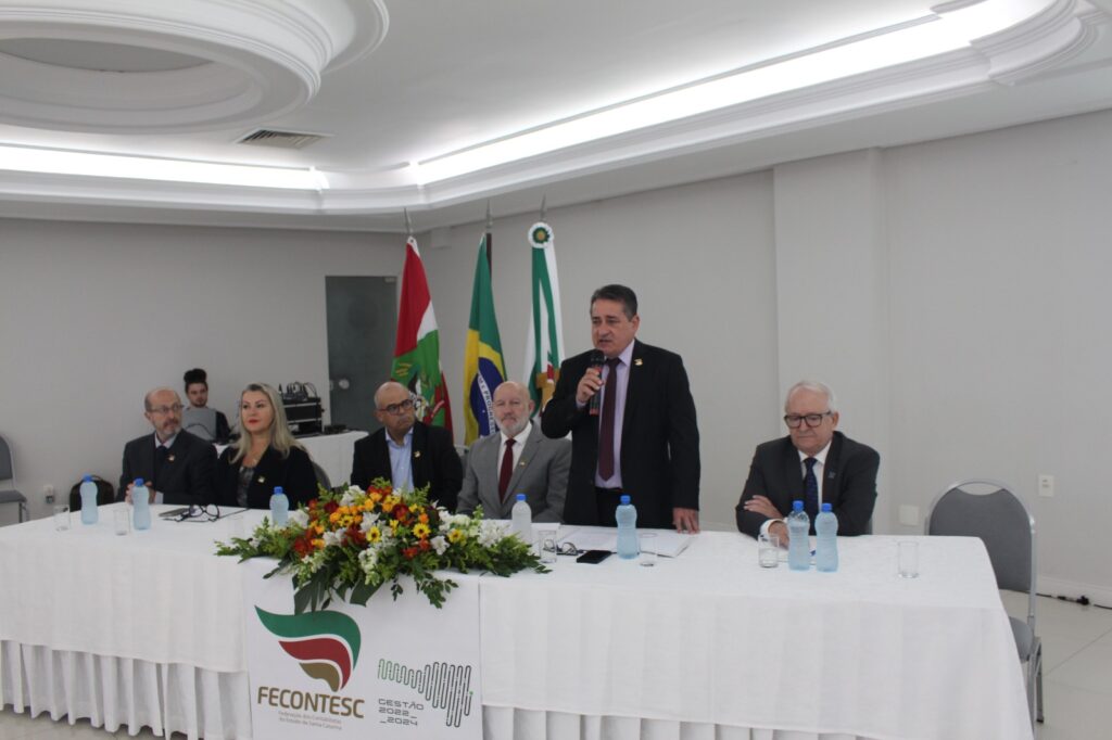 Abertura – Os trabalhos tiveram início às 8h30 com as boas-vindas do presidente da Fecontesc, Dalvair Anghében. A mesa de honra contou com a presença figuras do setor, incluindo Laenio Mota Oliveira, Vice-Presidente da Fecontesc, Regiane Waltrick, Vice-Presidente Regional Litoral, Alvacir Luiz Bahr, Presidente do Sindicont Blumenau, Tadeu Oneda, Presidente do CNCont, representando ainda a Feconbras e Elinton Oliveira Marçal, Secretário de Desenvolvimento Econômico, Inovação e Empreendedorismo de Blumenau. Todas as autoridades fizeram uso da palavra brevemente e abordaram os avanços e desafios do setor contábil.