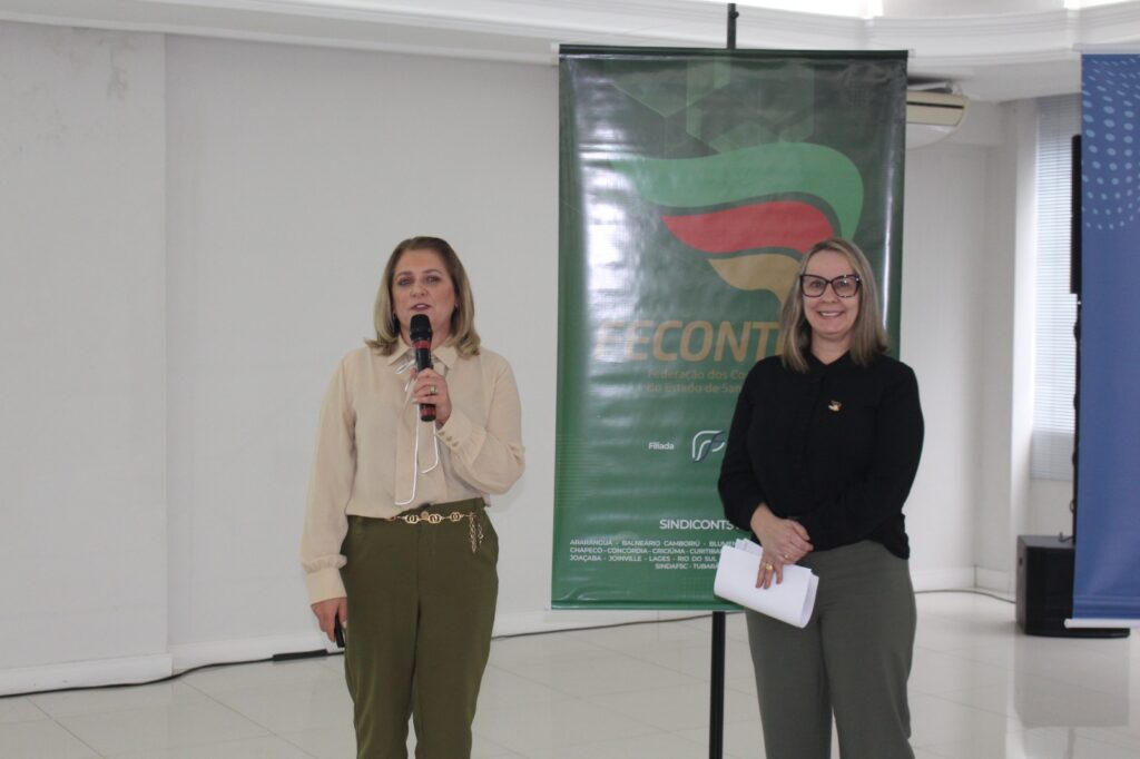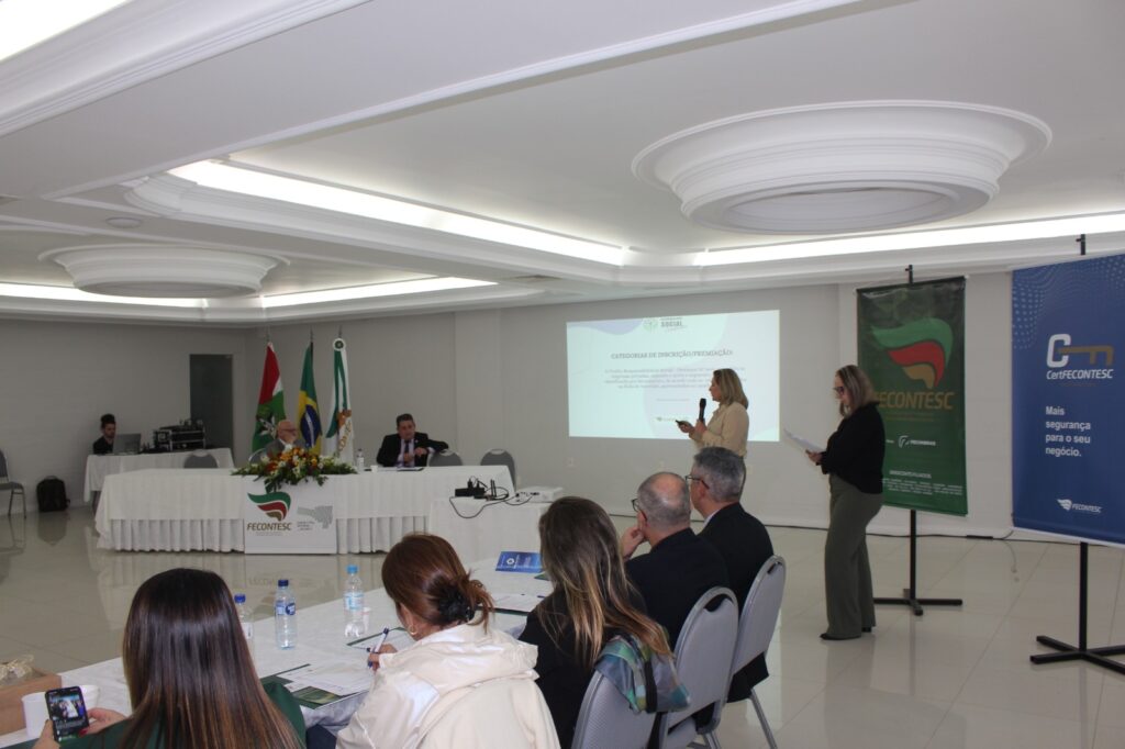 Em seguida foi realizada a apresentação sobre a participação da Fecontesc na Comissão Mista no processo do Troféu e Certificação de Responsabilidade Social da Alesc, pelas representantes Elaine Guarnieri, diretora de Ações Sociais, e Gislei Hemsing.