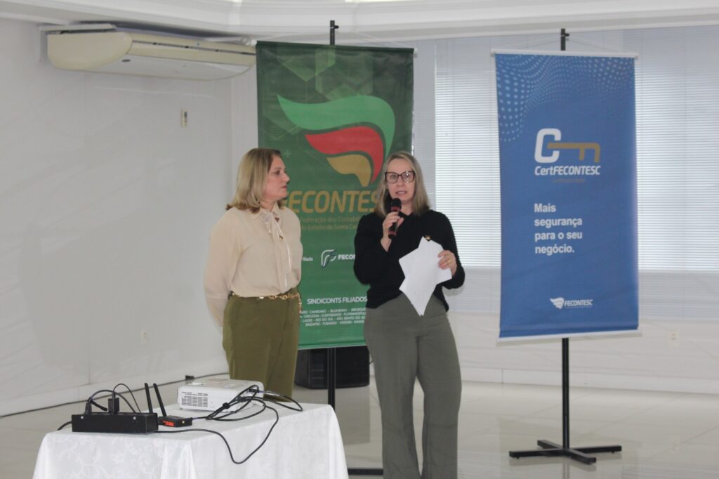 Parcerias e entidades – A pauta ainda teve as apresentações por parte dos representantes de parceiros do sistema Fecontesc: Malha Fina do Contador, Adv Integra, Tributo Justo e Somaxi.