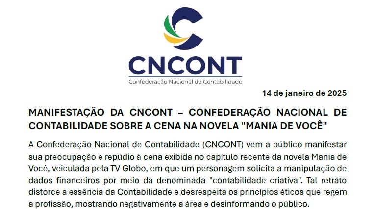 MANIFESTAÇÃO PARA TV GLOBO DA CONFEDERAÇÃO NACIONAL DE CONTABILIDADE SOBRE CENA NA NOVELA “MANIA DE VOCÊ” Brasília, 14 de janeiro de 2025 A Confederação Nacional de Contabilidade (CNCONT) vem a público manifestar sua preocupação e repúdio à cena exibida no capítulo recente da novela Mania de Você, veiculada pela TV Globo, em que um personagem […]