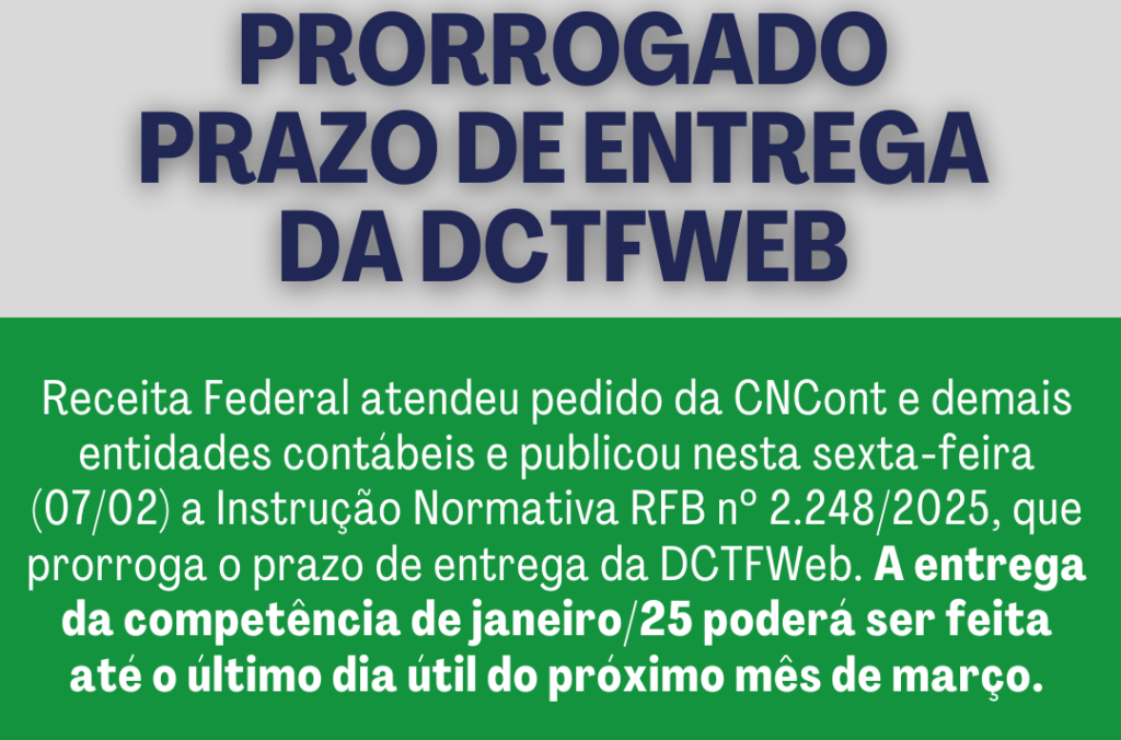 A Receita Federal publicou nesta sexta-feira (07/02) a Instrução Normativa RFB nº 2.248/2025, que prorroga o prazo de entrega da Declaração de Débitos e Créditos Tributários Federais Previdenciários e de Outras Entidades e Fundos (DCTFWeb) referente à competência janeiro de 2025. Com a mudança, a entrega poderá ser feita até o último dia útil de […]