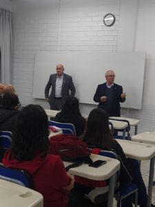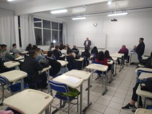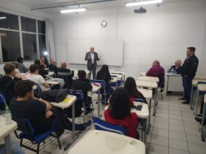 Durante a palestra, Dalvair Anghében, Tadeu Oneda e Cleverson Lima da Silva contaram um pouco do dia a dia e esclareceram dúvidas dos alunos sobre a profissão.