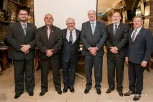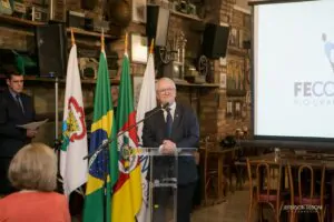 O presidente da Fecontesc, Dalvair Anghében, acompanhou a homenagem junto com os ex-presidentes da Fecontesc, Tadeu Oneda (ex-presidente da Feconbras) e Itelvino Schneider.
