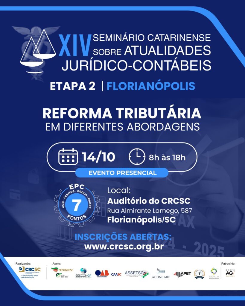 Agora, na capital catarinense, o encontro terá como tema “Reforma Tributária em diferentes abordagens”, ampliando a discussão para outros setores da economia. O evento reunirá especialistas de destaque nacional, que compartilharão análises e orientações práticas para a atuação profissional diante das mudanças trazidas pela reforma. A participação ainda garante 7 pontos de EPC aos inscritos.